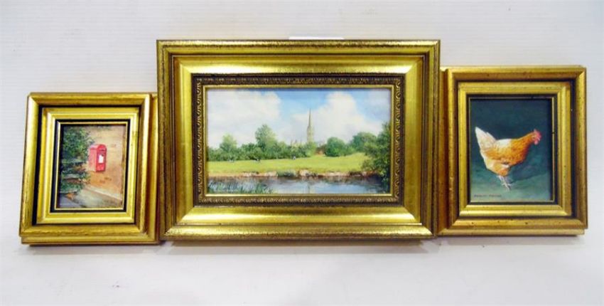 Robert Hughes RMS HS Miniature oils on board "Clarissa", 7cm x 6cm, "Postbox at Pewsey" and "Salisbury Cathedral" (3)