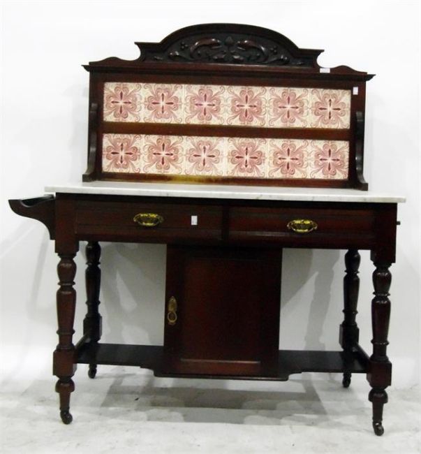 Late 19th century marble-top washstand with floral tile back, two frieze drawers with pot cupboard and open shelves below, on turned legs with castors, width 107cm