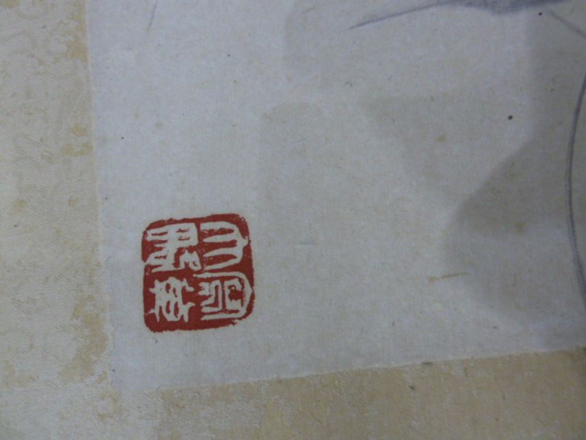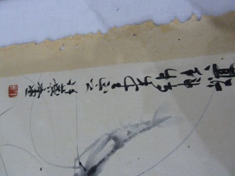 Japanese scroll watercolour wall hanging, abstracts, signed (damaged) (VAT payable on hammer) (Provenance:- Slimbridge Wildfowl and Wetlands Trust, Glos)