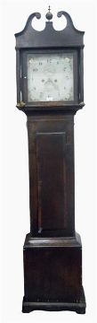 19th century oak longcase clock with eight-day movement, broken swan neck pediment with brass central finial and hood flanked by two pilasters, door opening to reveal painted dial, Arabic numerals, date aperture and seconds subsidiary dial, trunk with tunbridgeware style stringing, crossbanded door to box base, 202cm high