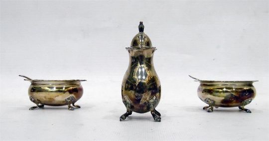Similar three-piece silver cruet set comprising of two silver salts with blue glass liners and a pepperette, 133g in total
