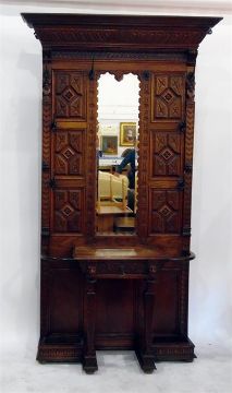 19th century oak hall stand with carved and mirrored back, metal hooks, frieze drawer and umbrella stand, 100cm wide approx