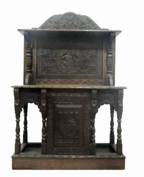 19th century carved oak revived Renaissance style cupboard with overall foliate carving, open shelf back, the central cupboard below, with open bottom shelves to either side, raised on a plinth base, width 100cm