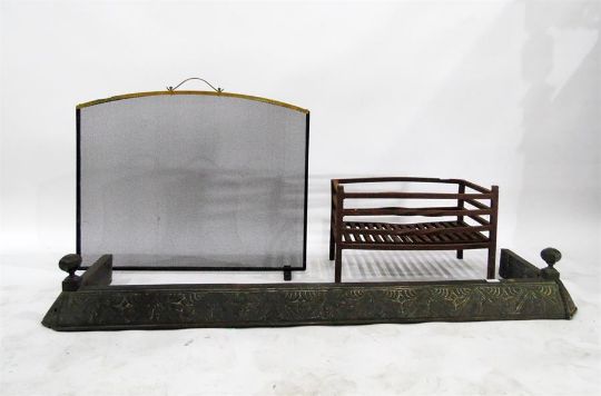Metal spark guard, a cast iron fire grate and a brass fire curb (3)