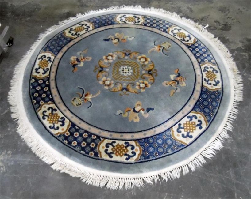 Chinese circular wool rug, blue ground with beige and pink decoration, 177cm diameter