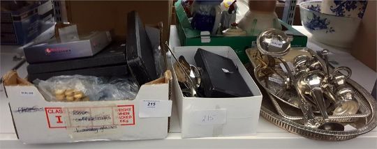 Large quantity of stainless steel flatware and silver plated flatware including Kings pattern soup ladle, condiments, trays, etc