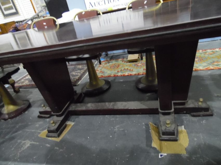 Mahogany dining table (seating 12) and a set of 10 patent tubular framed pedestal swivel dining chairs Re: Enquiry - Toys, Dolls, Models, Antiques & Interiors (4th and 5th December)Thanks for your enquiry, the dimensions for the table top are 100cm x 260cm and the height is 77cm. They are a few scratches and wear to both the table and chairs. Attached are some further images of the lot.