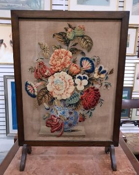Victorian wool and beadwork floral tapestry panel within an oak frame stand, 82cm x 58cm