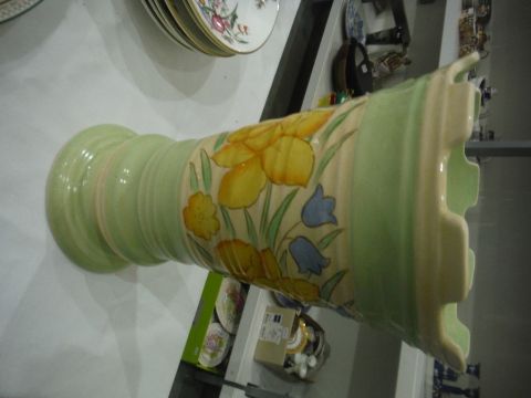 Quantity of decorative pottery to include studio pottery group of stylised figures playing instruments, a rectangular tapered vase in the style of Troika, a Burleighware ribbed flared rim vase with daffodil hand-painted decoration, another vase and a Beswick model of a foalRe: Enquiry - Toys, Dolls, Models, Antiques & Interiors (4th and 5th December)Three figures; unable to see any damage - perhaps some very light scratches. Foal - some crazing and chip to ear. Brown vase - some light scratches. Tall vase - significant crazing interior has been used for flowers.