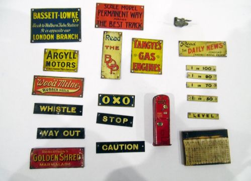 Quantity of miniature / model railway tin plate signs to include; 'Bassett-Lowke Ltd Book to Holborn Tube Station It is opposite our LONDON BRANCH', ' Tangye's Gas Engines', 'Scale Model Permenant Way makes The Best Track', 'Read The BOP', 'Wood Milne Rubber Heels', 'Argyll Motors', 'OXO', 'Robertson's Golden Shred Marmalade', 'Way Out', 'Whistle' and 'Stop' etcetera together with a tin plate model railway ticket machine