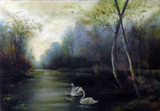 E BoddyOil on canvasLake scene with a pair of swans and two cygnets in the foreground, signed lower right 'E Boddy', 45cm x 66cm Assorted loose unframed watercolours and drawings including botanical studies, mixed media, pencil studies, landscape and floral prints