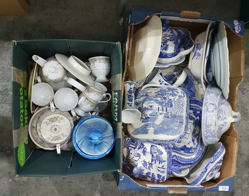 Quantity blue and white pottery tureens 'Willow' pattern, quantity Noritake tea china, other ceramics and a Victorian circular footstool with tapestry top (2 boxes)  Green meat dish withdrawn from lot