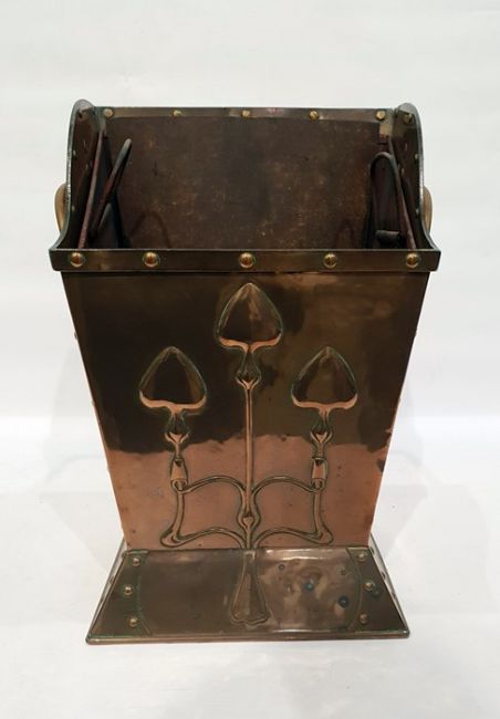 Art Nouveau copper coal bucket with an internal liner, stud decoration, fixed handle, 45cm high Re: Enquiry - Toys, Dolls, Models, Antiques & Interiors (4th and 5th December)lot 205  The handle is fixed, the liner pulls out, some age spotting , solder repairs on the back approx 44.5 cm high, 26.5 cm deep and 30 cm wide excluding handles maximum.