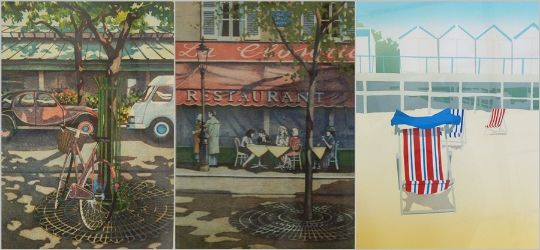 After Peter Buridge (b.1960) Colour etchingParisian cafe in Parisian avenue, each signed and titled in pencil and limited edition 7/150 (see verso for details) After V Charlesworth Artists proof "7pm Bank Holiday Monday", deckchairs on sand with huts behind, signed and inscribed in pencil