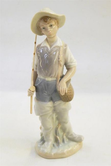 Lladro figure of medieval style with fencing foil and pile of books, 30cm high (damaged) and a Lladro figure of a fisher boy, 22cm high (2)