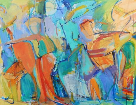 H James Oil on board, continental lakeside scene with mountains in background, approx 31x39cmwithJ Last -  oil on canvas, abstract figures, approx. 75 x 97cm (Unframed) (2)