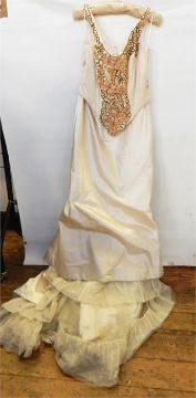 Satin vintage style evening dress with an embroidered bodice, net overlay with lace-up back, a fish-tail train and net petticoat