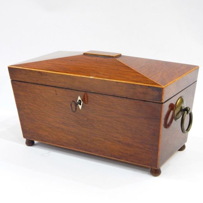 Inlaid Georgian mahogany tea caddy, sarcophagus-shaped with line inlay to the borders, brass ring side handles, the interior fitted with two sliding covered tea caddy boxes, etched glass mixing bowl, having ivory escutcheon plate, on tab feet, 32cm wide