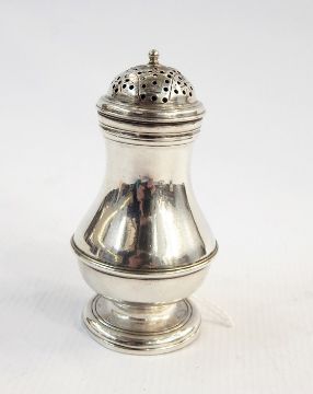 George II silver pepperette with girdled baluster form, pierced engraved mid surmounted by ball finial (possibly by William Gwilliam, London 1749), indistinctly hall and date mark to base, 2.1 troy oz