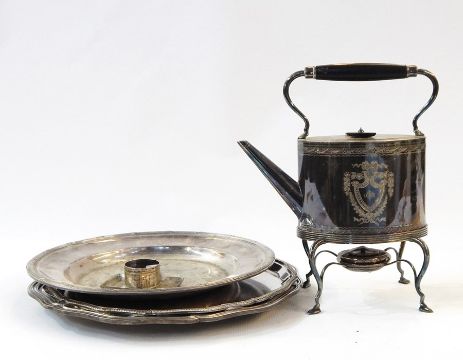 EPNS spirit kettle, three silver plated trays, a silver plated napkin ring and a sterling silver ashtray marked on the back 'Summer 1932' (6)