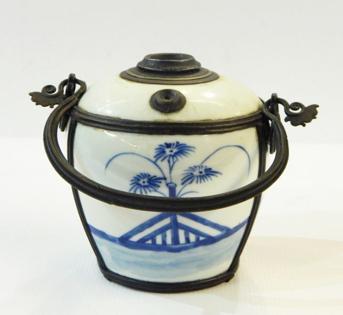 Chinese porcelain and bronze mounted oil lamp of shouldered oval shape and painted in underglaze blue with figures in a garden, six-character mark to base and having swing handle, the main body 12.5cm high Re: Enquiry - Toys, Dolls, Models, Antiques & Interiors (4th and 5th December)There do apear to be threads but impossible to tell how good as very dirty. I have attached some photos so you may be able to decide