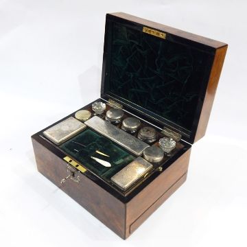 Victorian mother of pearl inlaid figured walnut vanity box, with silver plated cut glass toilet bottles, jars and boxes, side drawer, approx 30cm wide