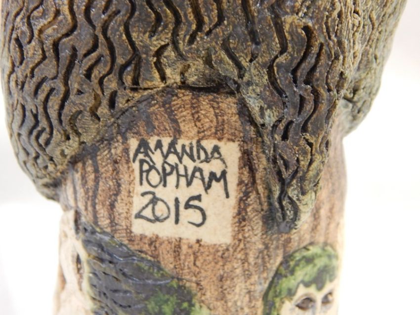 Amanda Popham (b.1954) figure of Pan from the Greek Myths Series, figure of Pan seated on tree stump decorated with figures, signed and dated 2015, 45cm high