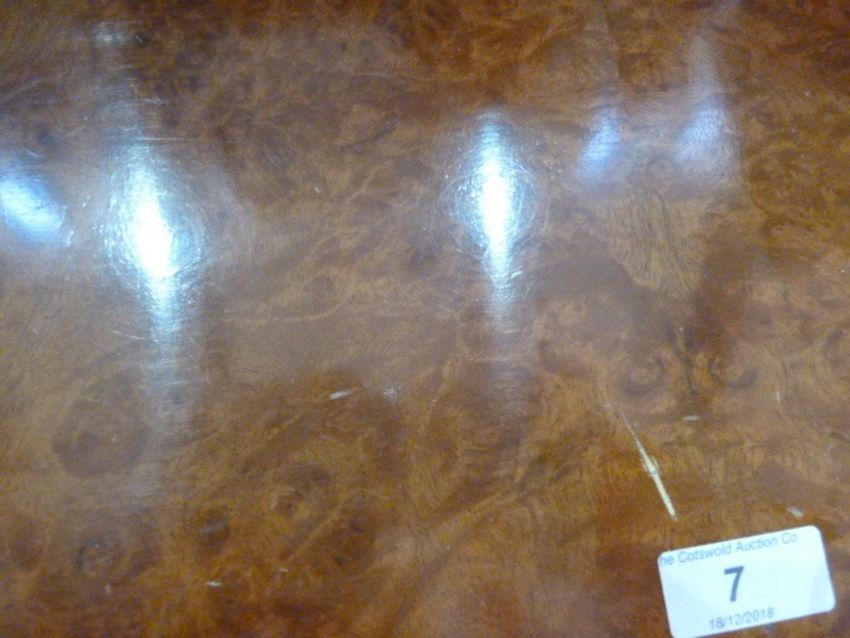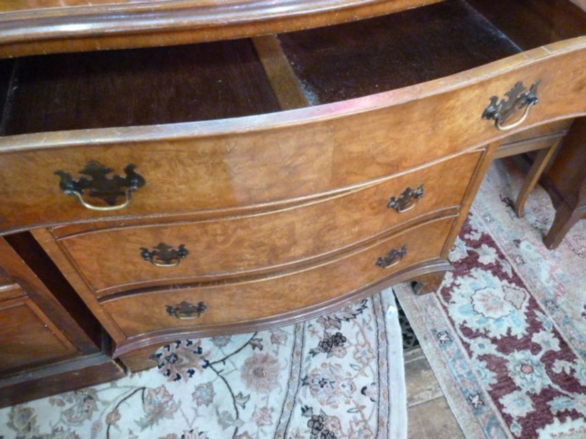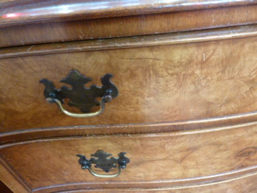 Reproduction figured walnut serpentine-front chest of four long drawers with brass drop handles and shaped backplates, on bracket feet, 78.5cm wide approx Re: Enquiry - Toys, Dolls, Models, Antiques & Interiors (4th and 5th December)The piece has had a lot of wear - many chips to the veneer and a small strong scratch on the top. Please see images attached
