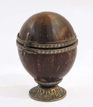 Antique coconut cup with silver-coloured metal mounts, all formal engraved and the handle in the form of a hand, raised on white metal dome and circular foot, 16cm high