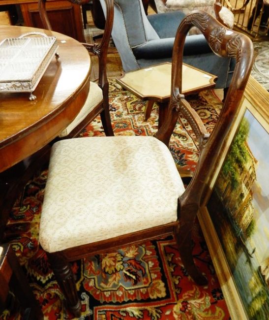 Five Victorian rosewood dining chairs, each with scroll and rosette carved top rail, beaded and scroll cross-rail, Trafalgar seat, on reed tapering supports (5)