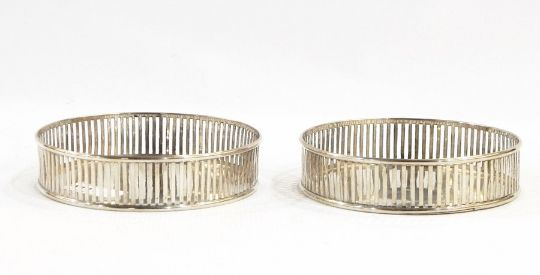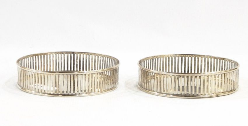 Pair Austro-Hungarian silver-coloured metal wine coasters, each circular and with pierced grille sides, approx 7.5oz