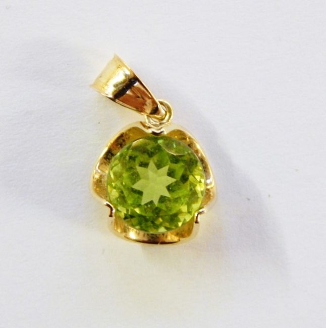 9ct gold and peridot pendant, the circular stone in scallop setting and pair matching earrings with 10K Mexico mark