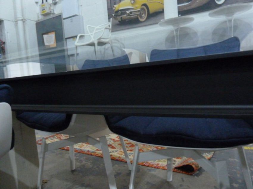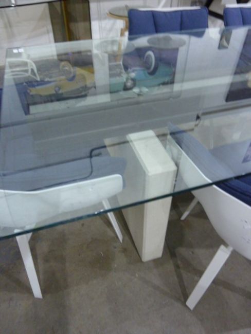 Rectangular glass top coffee table with bevelled edge, raised on curved chrome steel support, length 127cm (VAT payable on hammer)