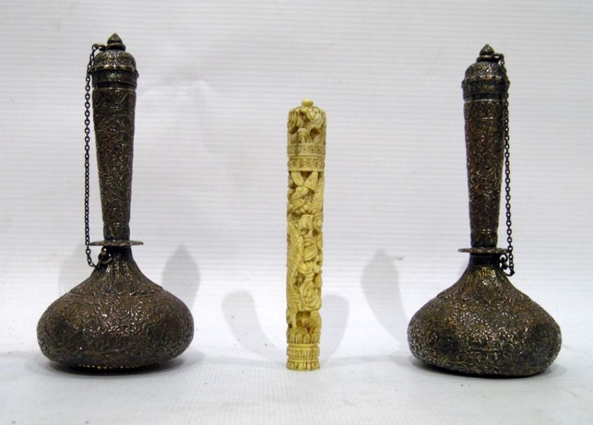 Pair of Indian white metal scent bottles with covers and a Chinese carved ivory needle case (3)