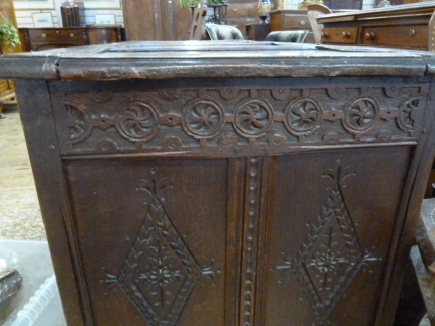 16th/17th century antique oak coffer, the front with four round arched carved panels, chequerboard and formal leaf decorated, stylised floral roundels to the frieze, four-panelled top, on carved stile supports, 147cm wide