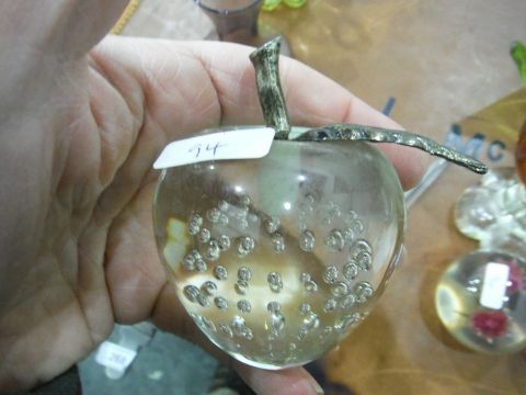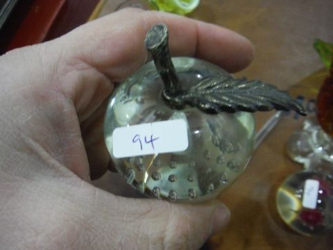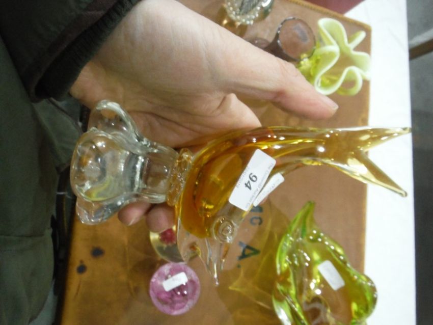 Chribska green and peach glass bowl, assorted paperweights to include Caithness 'Daydreams' example, glass fish ornament, vaseline glass bowl, etc