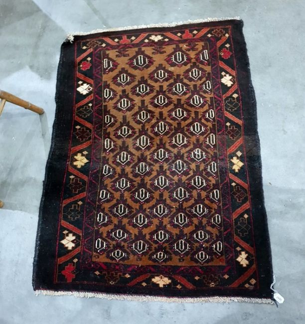 Small old Baluchi rug with graduated trellis work of allover stylised red and black plants on a beige field, trailing vine border, 128 x 92cm