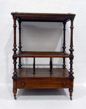 Victorian burr walnut veneered and inlaid Canterbury, the top having three-quarter fretwork carved gallery, turned supports and fitted a drawer to base, 61cm wide