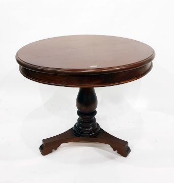 Victorian style mahogany circular top supper table with moulded edge, plain frieze, on turned pedestal supports with triple platform base, diameter 99cm, together with four Victorian style bar backed dining chairs