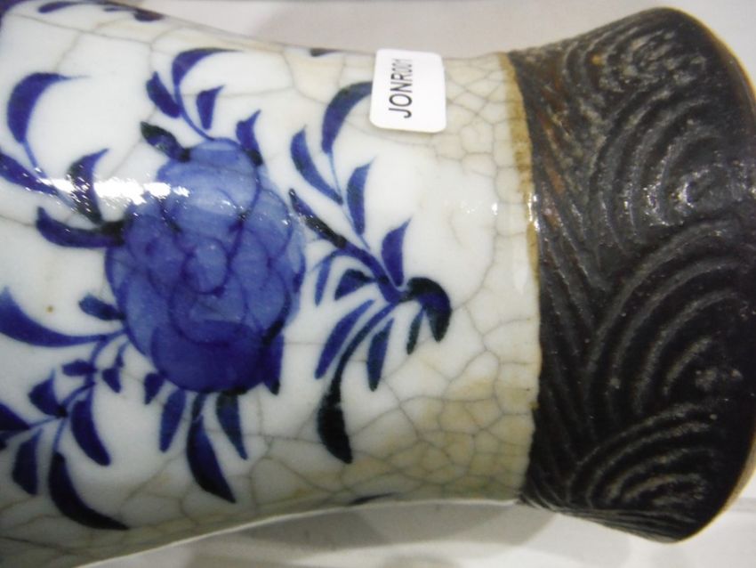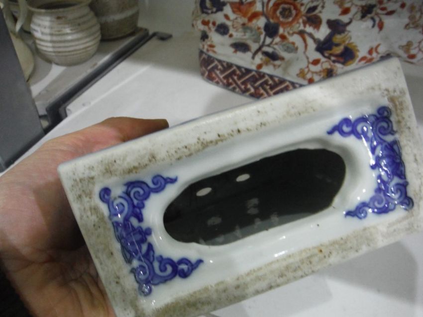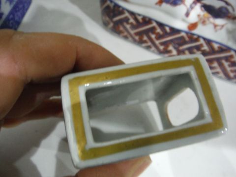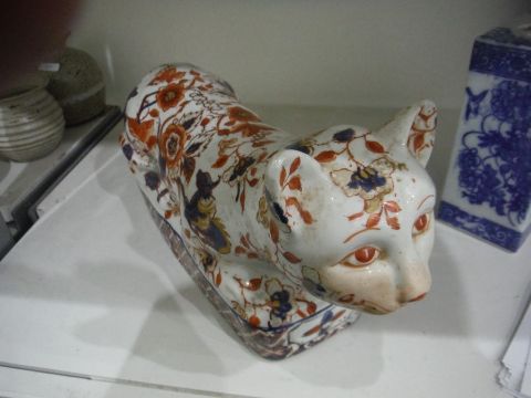 Imari pottery figure of recumbent cat, six-character mark to base, a 20th century Chinese vase decorated with birds amongst foliage, four-character mark to base, a Chinese blue and white decorated plate decorated with insects amongst foliage, studio mark to base, a 20th century Chinese porcelain matchbox case and a transfer-printed porcelain vase (5)
