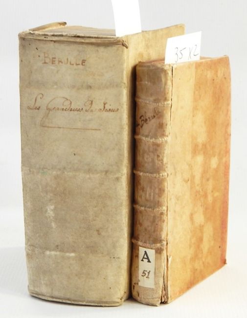 De Berulle"Discours de l'Etat et des Grandeurs de Jesus", Antoine Estienne 1623, vellum, 2 vols, library stamps on ffep, some ink staining, vol 2 is missing its endpaper, annotations and staining (2)
