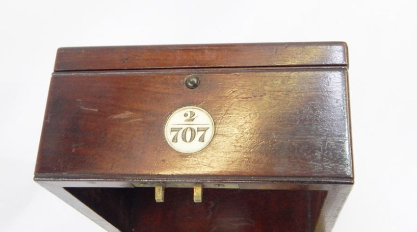 Mid 19th century marine chronometer by Barraud & Lund, Cornhill, London with silver dial, Roman numerals, with blued hands, subsidiary seconds dial and up/down indicator, numbered 2/707 and housed in a two part opening mahogany case with ivory plaque, again numbered 2/707