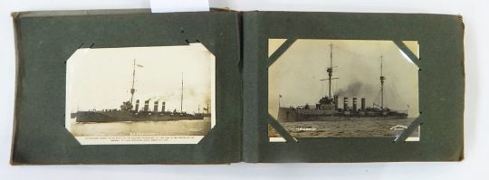 Postcard album containing WWI ship, steamship, regiment and other naval ships and a quantity of loose cigarette cards