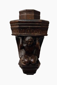 Carved oak wall-hanging corbel of an angel supporting foliate decorated platform, 31cm high and a wooden shield with marquetry inlaid floral decoration (2)