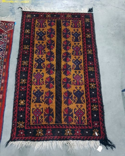 Mustard ground Eastern rug with red and blue repeating motifs either side of a central black ground divider, to a black ground foliate decorated border, 145cm x 81cm