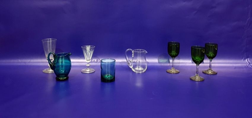 19th century stem wine with knopped stem and thumb cut and finely trellis cut panels, another 19th century flute, three drinking glasses with green glass bowls and three other items