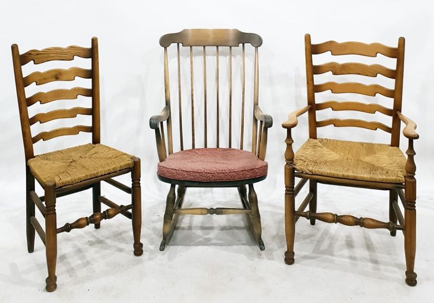 Two modern ladderback dining chairs on turned supports and front stretchers and a stickback rocking chair (3)