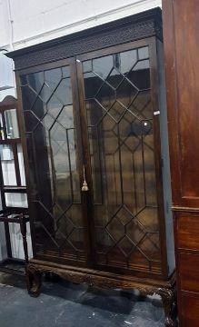 20th century Chippendale-style mahogany glazed bookcase, the top with blind fret carved frieze above four fitted shelves enclosed by astragal glazed doors, on ornate foliate carved serpentine apron and ornate cabriole supports, scroll feet, 132cm wide
