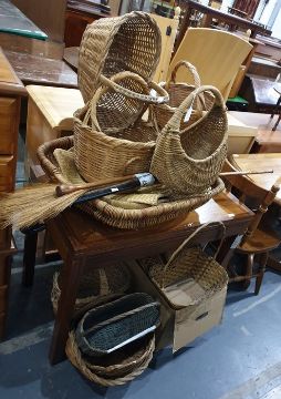 Large collection of wicker baskets together with walking sticks