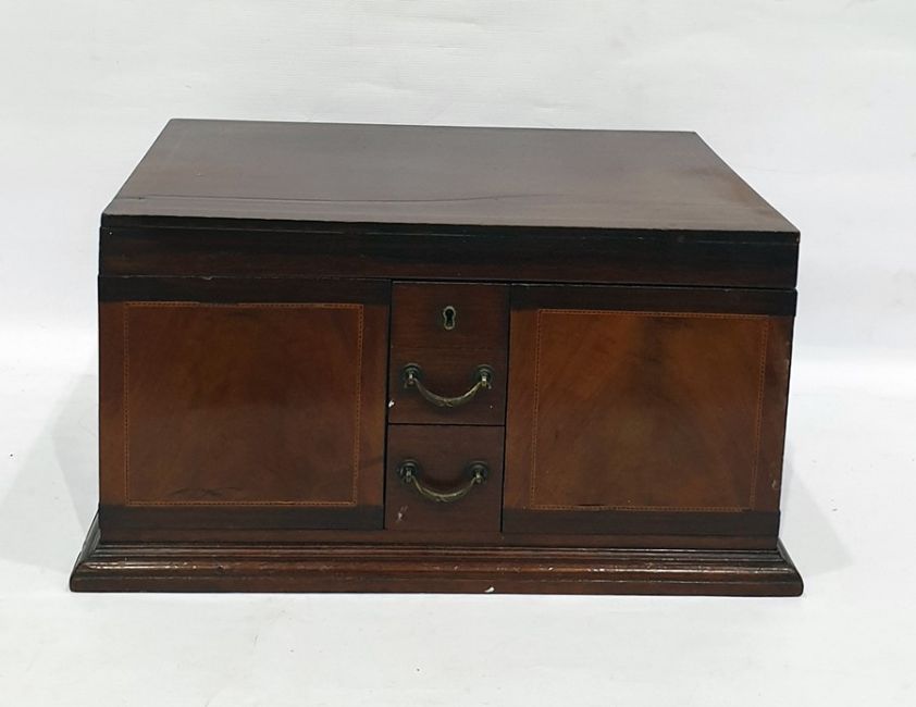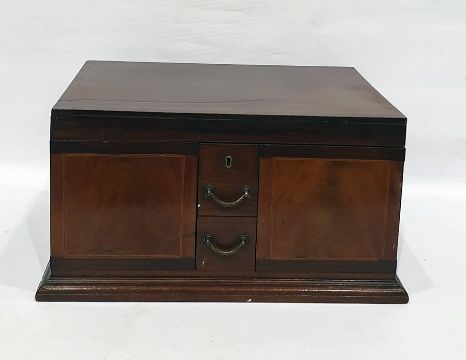 Edwardian inlaid mahogany canteen cabinet, the rising cover revealing a fitted compartment over two fitted trays, enclosed by a pair of doors and with carrying handles, 50cm x 34cm x 25cm